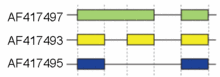 These modes describe basic splicing mechanisms, but may be inadequate to describe complex splicing events. For instance, the figure to the right shows 3 spliceforms from the mouse hyaluronidase 3 gene. Comparing the exonic structure shown in the first line (green) with the one in the second line (yellow) shows intron retention, whereas the comparison between the second and the third spliceform (yellow vs. blue) exhibits exon skipping. A model nomenclature to uniquely designate all possible splicing patterns has recently been proposed.[18]
