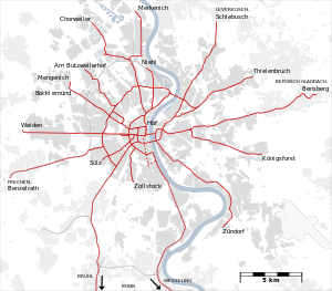 The Cologne Stadtbahn operates an extensive light rail and rapid transit system (partially underground) serving Cologne and some neighboring cities. Its name derives from the German term for Light Rail, Stadtbahn. It is operated by the Kölner Verkehrs-Betriebe (KVB) (Cologne Transit Company) and is part of the Rhine-Sieg Transit Association. The rail system stretches across 192 kilometers with 11 lines. Two lines (16 and 18) link the system to the neighboring transport system of Bonn. The Cologne Stadtbahn is not a true subway system, even though a large part of the system operates underground, especially in the downtown area. Instead it is a rapid tram system, each line crosses at least one street at street level without absolute right of way.