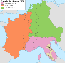 The Treaty of Mersen or Meerssen, concluded on 8 August 870, was a treaty of partition of the realm of Lothair II by his uncles Louis the German of East Francia and Charles the Bald of West Francia, the two surviving sons of Emperor Louis I the Pious. The empire of Louis the Pious, son of Charlemagne, had originally split in three parts by the 843 Treaty of Verdun, whereas his eldest son Lothair I received the Imperial crown and the personal realm of Middle Francia, while: