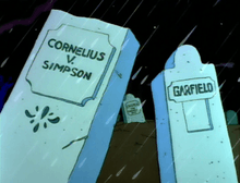In the opening segment of the first five episodes, the camera zooms through a cemetery where tombstones with humorous epitaphs can be seen. These messages include the names of canceled shows from the previous season, deceased celebrities such as Walt Disney and Jim Morrison[17] and a tombstone with an inscription that read "TV violence" that was riddled with bullets as the camera panned on it.[3] They were last used in "Treehouse of Horror V", which included a solitary tombstone with the words "Amusing Tombstones" to signal this.[16] The tombstone gags were easy for the writers in the first episode, but like Marge's warnings, they eventually got more difficult to write, so they were abandoned.[13] Another reason they were dropped was that the tombstones would list television shows that had been canceled the previous season; after a few years, several of the shows that were canceled were produced by former Simpsons writers.[18]