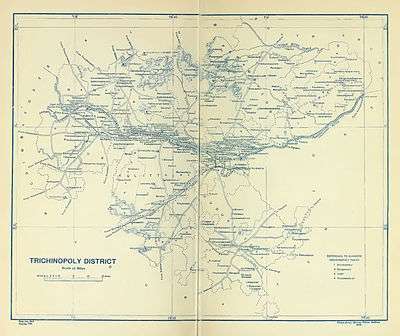 The Trichinopoly district was a district of the erstwhile Madras Presidency of British India. It covered the present-day districts of Tiruchirappalli, Karur, Ariyalur and Perambalur in the Indian state of Tamil Nadu. The administrative headquarters was the town of Trichinopoly, Trichy or Tiruchi, now known as Tiruchirappalli. The district covered an area of 2,632 square miles (6,820 km2) in 1907. It was bound by the districts of South Arcot to the north, Salem to the west, Coimbatore to the west and north-west, Tanjore to the east and Madura to the south. The princely state of Pudukkottai remained within the juridsiction of Trichinopoly district from 1865 to 1947.