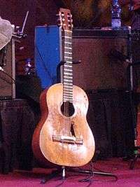 During a concert at Floore's Country Store in Helotes, Texas, a drunk man stepped on Nelson's Baldwin. David Zettner and Jimmy Day, members of Nelson's band The Record Men took the guitar to Shot Jackson, a luthier in Nashville, Tennessee.[2] Jackson, who considered the damage unreparable, offered Nelson a Martin N-20 nylon-stringed classical guitar made out of Brazilian Rosewood. Nelson instructed him during a phone conversation to move the pickup from the Baldwin to the Martin.[3] The instrument allowed him to amplify his acoustic sound to perform in large dance halls, contributing to his signature style.[4] Nelson bought the guitar unseen for $750,[3] and named it after Roy Rogers' horse "Trigger".[5] Nelson desired to approach the playing style and sound of jazz musician Django Reinhardt.[6]