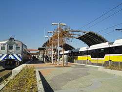 Trinity Mills Station is a light rail/commuter rail station in Carrollton, Texas with service on the DART Green Line[2] and the DCTA A-Train. The station opened as part of the Green Line's expansion in December 2010, replacing the nearby North Carrollton Transit Center. (The latter is fully closed including the station house.) A-Train service began June 20, 2011.[3]