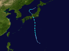 Formative bands wrapped around its ragged and ill-defined LLCC.[6] Satellite image revealed that Etau had convection increasing near its center,[7] therefore, the JTWC upgraded it to a tropical storm.[8] The system later reached its peak intensity as a severe tropical storm on September 8 with maximum sustained winds of 95 km/h (60 mph).[9] Some weakening took place before the system made landfall over Chita Peninsula, Aichi, in the Chūbu region of Japan, early on September 9. Transition into an extratropical cyclone ensued as Etau became embedded within a frontal boundary.[10] This process completed later that day as Etau emerged over the Sea of Japan.[11] The extratropical remnants of Etau later interacted with and was absorbed by another but larger extratropical system which were the remnants of Typhoon Kilo on September 13.