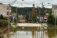 Most municipalities in Greater Binghamton and the Penn-York Valley saw water levels top the levees, inundating several downtown areas along the river. Many of the locations under water had not flooded since the mid-1930s, due to the construction of levees.[54] Over 20,000 residents were forced to evacuate in Broome County, and downtown Binghamton was closed off. Residents who were downstream from the Forest Lake Dam and the Elk Lake Dam were evacuated.[55] The village of Owego was particularly hard-hit, with 95 percent of the community under water.[56] In the aftermath, several roads were closed, including Interstate 88, which was blocked by a mudslide, and NY Route 17.