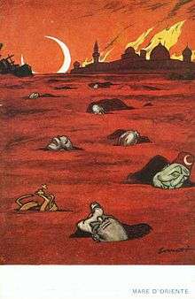 On October 23, 1911 nearly 500 Italian soldiers were slaughtered at Sciara Sciatt in the outskirt of Tripoli by Turkish troops.[28] As a consequence in the next day—during the 1911 Tripoli massacre—Italian troops systematically murdered hundreds of civilians by moving through the local homes and gardens one by one, including setting fire in the fighting to a mosque with one hundred refugees inside.[29] Although Italian authorities attempted to keep the news of the massacre from getting out, the incident soon became internationally known.[29] The Italians started to show photos of the massacred Italian soldiers at Sciara Sciat in order to justify their revenge.
