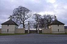 The Fermors' house at Tusmore was large, for in 1665 it was assessed as having 19 hearths for the hearth tax. It was built of local stone and had a Roman Catholic chapel as well as ornamental gardens and a fish pond. After 1758 William Fermor had the house demolished except for the chapel and commissioned the Scottish architect Robert Mylne to design a new house. The exterior was completed by 1770 and the interior by 1779.[1] Mylne's house was of seven bays[2] and built of local stone, most of it from Fritwell. Mylne laid out the gardens and landscaped the park, the latter with a lake and an ornamental Temple of Peace dedicated to the late poet Alexander Pope (1688–1744).[1] Pope had been a friend of the Fermor family and in 1712 had written The Rape of the Lock about an incident in which Robert Petre, 7th Baron Petre had offended Arabella Fermor.