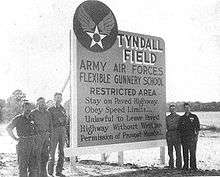 Tyndall Field was opened on 13 January 1941 as a gunnery range. The airfield was named in honor of 1st Lt Frank Benjamin Tyndall (1894–1930).[3] With the establishment of the United States Air Force in 1947, the facility was renamed "Tyndall Air Force Base" on 13 January 1948. In December 1940, a site board determined that Flexible Gunnery School No. 9 would be located 12 miles (19 km) southeast of Panama City, Florida on East Peninsula. On 6 May 1941, Army and local dignitaries held an official ground breaking for the school. Panama City's mayor, Harry Fannin, dug the first spade full of sand, and Colonel Warren Maxwell, Tyndall's first commander, wielded the first ax on the stubborn palmetto plants, so common on the East Peninsula. The site was covered with pine and palmetto trees, scrub brush, and swamps. Bulldozers worked around the clock to clear the brush and fill in swamps.[4]