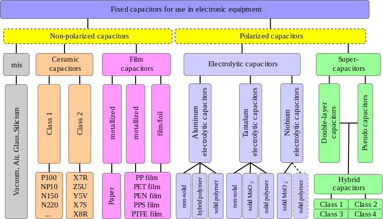 The most important group is the fixed capacitors. Many got their names from the dielectric. For a systematic classification these characteristics can't be used, because one of the oldest, the electrolytic capacitor, is named instead by its cathode construction. So the most-used names are simply historical.
