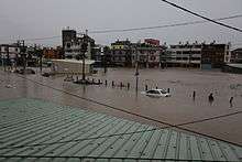 In response to the Taiwan flooding in Kaohsiung, officials deployed 7,888 troops to the southern portion of the island to assist in rescue and recovery work.[41] Soldiers also set up five medical centers,[25] and utilized amphibious vehicles to rescue people in flooded areas.[24] Taiwan's president Ma Ying-jeou toured the flooded regions on September 23, emphasizing that efforts to drain the flooding should be the main priority.[63] More than 100 buildings in Kaohsiung required water pumps and thousands of volunteers to remove standing water from basements and streets. The mayor Kiku Chen temporarily suspended her reelection campaign due to the floods.[46] About 80% of the factories in Kaohsiung were reopened by September 21.[25] The high crop damage allowed farmers to qualify for low interest loans.[36] Rail lines took two weeks to reopen due to damage.[42] Power and water service was restored within days of the storm, although residents in flooded areas were advised to boil water before usage.[25] There was also an increase in dengue fever after the floods.[64] The Red Cross Society of China donated about US$100,000 in the days after the storm.[65] The government announced on September 20 that families affected by the floods would receive NT$30,000 (US$945.92) per house.[66] Throughout Taiwan, exports during September 2010 decreased 6.9% from August's levels due to the storm and an industrial fire.[67]