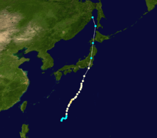 Initially, the depression was expected by the JTWC to move north before accelerating towards the northwest. On August 17, the JTWC upgraded the depression into a tropical storm. At this time, the agency anticipated Thad to re-curve well east of Japan. By 0000 UTC on August 18, the JTWC upgraded Thad to typhoon status as the cyclone developed a ragged eye.[1] Six hours later, the JMA followed suit. During the evening of August 18, the agency estimated that Thad reached its peak intensity of 80 mph (130 km/h) and a minimum barometric pressure of 955 mbar (28.2 inHg).[2] Early the next day, the JTWC estimated peak winds of 100 mph (160 km/h). According to the JMA, Thad would maintain its peak wind speed until August 21, when the storm weakened slightly.[2] However, the JTWC suggested that Thad began to deteriorate on August 20. The next day, forecasts from the JTWC indicated that the typhoon was expected to re-curve and accelerate due to a trough located south of Japan. However, since the trough moved into the Sea of Japan instead, a subtropical ridge developed east of Typhoon Thad. On August 22, however, Thad accelerated northward in the general direction of Japan. At 0000 UTC on August 23, the JTWC downgraded Thad into a tropical storm while moving onshore in central Japan.[1] Several hours later, the JMA followed suit, even though Thad had moved well inland by that time.[2] By this time, cooler air had taken toll on the storm,[1] and that afternoon, data from both agencies indicated that Thad finished its transition into an extratropical cyclone.[4] By that time, Thad merged with a trough over the Tatar Strait.[1] However, the JMA continued monitoring the system until the morning of August 25.[2]