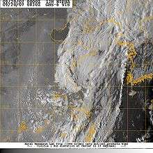 One person was killed and another was injured in Taipei after a 20 m (65 ft) high scaffolding in a construction site collapsed.[25][26] At least 495 mm (19 in) of rain fell in the mountains of Taiwan,[10] triggering flooding which damaged about 24 hectares of crops, leaving NT$7.8 million (US$236,300) in losses. A total of 8,795 residences were left without power at the height of the storm. Several roads and bridges were also washed out from flooding.[9] Officials in Taiwan recorded 29 landslides, mostly in northern areas, and urged residents to evacuate due to the possibility of more.[27]