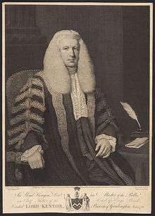Lord Kenyon, Baron of Gredington, in the County of Flint,[1] is a title in the Peerage of Great Britain. It was created in 1788 for the lawyer and judge Sir Lloyd Kenyon, 1st Baronet. He served as Master of the Rolls and as Lord Chief Justice of England and Wales. Kenyon had already been created a Baronet, of Gredington in the County of Flint, in 1784.[2] His grandson, the third Baron, briefly represented St Michael's in the House of Commons. His grandson, the fourth Baron, held minor office in the governments of Lord Salisbury, Arthur Balfour and David Lloyd George and also served as Lord Lieutenant of Denbighshire. In 1912 Lord Kenyon assumed by Royal licence the additional surname of Tyrell. As of 2010 the titles are held by his grandson, the sixth Baron, who succeeded his father in 1993.
