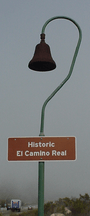 Distinctive route markers with symbolic mission bell and shepherd's crook are seen between Los Angeles and San Jose