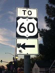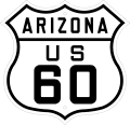 In 1927, what is now US 60 was signed as or roughly followed by SR 74 between the California border near Ehrenburg and Wickenburg, US 89 from Wickenburg to Florence Junction, US 80 from Phoenix to Florence Junction, US 180 from Florence Junction to Globe and US 70 between Springerville and the New Mexico border. The segment of highway between Springerville and Globe had not been constructed yet.[3][4][5] US 60 was extended into Arizona in 1932, from its original western terminus at US 66 in Springfield, Missouri.[6] While what is now US 60 was under construction between Globe and Springerville, US 60 was temporarily routed down SR 73 as US 60T through San Carlos and McNary. The current route through Show Low was completed sometime between 1935 and 1938.[7] US 60 through Arizona has had far fewer major changes than some other U.S. routes, but one notable example is being replaced by Interstate 10 between Los Angeles, California, and the highway's current terminus near Quartzsite. US 60 is now the only U.S. Route to serve Phoenix. US 70 (decom. 1969), US 80 (decom. 1977) & US 89 (decom. 1992) have all been truncated outside of Phoenix. The only other major change was being realigned from an "in-town" route along city arterials through Mesa, Tempe, and Phoenix to the old SR 360 alignment a few miles south and merging with I-10 and I-17 into Downtown Phoenix.[6]