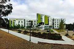 Most of the campus buildings serve an academic, research, or administrative purpose. Exceptions are the Rita Atkinson Residences, which houses 450 graduate students in a nine-story, two-tower structure,[7] and the Club Med dining facility at the base of the telemedicine building. The campus features two Stuart Collection works. Terrace, by Jackie Ferrara, consists of three tiled terraces which flow into one another to connect both wings of the Cellular and Molecular Medicine facility. It is the ninth work in the collection.[8] The fourteenth work, Standing by Kiki Smith, is a nude bronze woman raised on a concrete eucalyptus trunk trickling water from her hands to its roots. It was the artist's first permanent outdoor sculpture.[9]