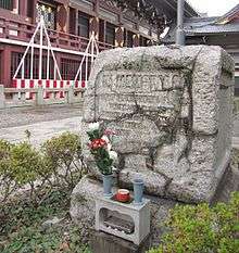 - ...[the American] government made no effort to raise the wreck or search it, and finally sold it to a Japanese wrecking company for fifteen hundred dollars. The wreckers found many bones of the lost men among the ship's timbers, and when the work was entirely completed, with their voluntary contributions they erected a tablet in the Ikegami grounds to the memory of the dead, and celebrated there the impressive Buddhist segaki (feast of hungry souls), in May 1889. The great temple was in ceremonial array; seventy-five priests in their richest robes assisted at the mass, and among the congregation were the American admiral and his officers, one hundred men from the fleet, and one survivor of the solitary boat's crew that escaped from the Oneida.