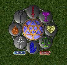 The virtues were first introduced in Ultima IV: Quest of the Avatar (1985), where the goal of the game is to practice them and become a moral exemplar. Virtues and their variations are present in all later installments. Richard Garriott's motives in designing the virtue system were to build on the fact that games were provoking thought in the player, even unintentionally. As a designer, he "wasn't interested in teaching any specific lesson; instead, his next game would be about making people think about the consequences of their actions."[19] The original virtue system in Ultima was partially inspired by the 16 ways of purification (sanskara) and character traits (samskara) which lead to Avatarhood in Hinduism.[17][20] He also drew on his interpretation of characters from The Wizard of Oz, with the Scarecrow representing truth, the Tin Woodsman representing love, and the Cowardly Lion representing courage.[21]