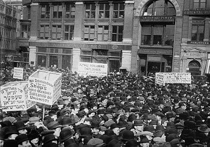 The Square's shopping district saw strikes in the S.Klein and Ohrbach department stores in 1934. White collar workers were among the worst paid in Great Depression era New York City, with union memberships being highly discouraged by store managers and often seen as fireable offenses. These strikes often involved acts of disobedience by the workers as many of them did not want to lose their jobs.[25] This period saw Union Square as a gathering point for many of the cities socialist and commnuist groups. The centennial of Union Square was seen as a thinly veiled effort to displace those elements with its draping of the square with flags and police demonstrations of anti protester drills.[26]