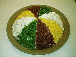 The union mark was at first popular in Norway as a sign of Norway's equal status in the union. In Sweden, it was always seen by some people as a desecration of their flag, and one of its adversaries called it the "herring salad"[7] (Norwegian: sildesalaten, Swedish: sillsalladen)[8] because of its resemblance to a popular dish on the Scandinavian smörgåsbord. It came to be popularly known under this name in both countries and to this day is its common denomination in these languages.