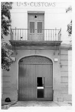 The facades are similar with regular door and window openings and with small balconies to the second-floor openings. There is a small partial false gable roof of Spanish barrel red-clay tiles around the four sides and around the courtyard. On the front (south) facade, facing the ocean, there are five bays with a large elliptical arch-headed passageway large enough for vehicular traffic. It is architecturally marked only by a plain, flat frame painted differently from the body of the building. There are plain board, double doors with a smaller pedestrian port in the right door. In the elliptical arch there is a simple fanlight window. Flanking the arched entrance are two large high windows on each side. The windows are two-leaf casements with exterior solid and Jouvered combination paneled shutters. Metal grilles are at each window. The walls have a simple low projecting base course, and the first floor walls are marked by horizontal incised coursing, all in stucco. There is a large molded string course between stories and on the second floor, five door openings, each with double-leaf doors that are half sash, which replaced the original louvered and paneled shutter combinations. Over the doors are sashed transoms, although the right group has been replaced by air conditioners. Each opening has a decorative wrought iron balcony with scroll support dating from the U.S. remodeling of the building. Previous to these wrought-iron balconies, the building had cast iron railings. "U.S. Customs" is lettered over the central window. At the top is a large double masonry molded cornice, surmounted by the small false partial gable in Spanish tiles, both from 1924. On the front only, there are three flag poles on the roof, and a large antenna system. On each side of the first floor passage entry is an alarm box and a plain light fixture.[11]