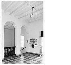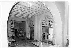 On the second floor, the staircase from the entry passage opens on a large lobby from a two-arched staircase arcade. The lobby extends from the front back to the courtyard and is floored with diagonally laid gray and white marble tiles. The walls, as are old walls in the building, are plastered, and the ceiling has exposed 4x10 beaded ausubo wood beams. Old double four-paneled doors and a transom open to the courtyard. The window in the stairhall has been filled in with glass brick.[16]