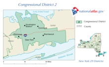 The 2nd Congressional District of New York is a congressional district for the United States House of Representatives along the South Shore of Long Island. It includes southwestern Suffolk County and a small portion of southeastern Nassau County. Peter King began representing the district beginning in January 2013.