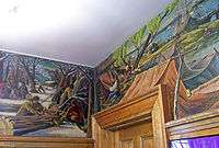Local artist Olin Dows painted murals in the lobby depicting Hyde Park's history, from Henry Hudson's Halve Maen docking in the nearby Hudson River during his 1609 voyage, to Britain's King George VI visiting Roosevelt at his house the year before.[8] He had previously painted similar scenes in the Rhinebeck post office.[1]