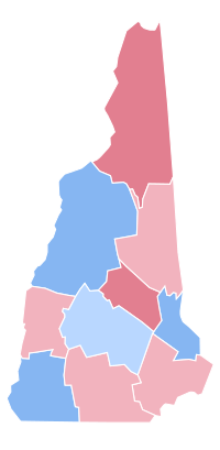 On November 8, New Hampshire voted for Hillary Clinton by a 0.37% margin, around a 2,700 vote difference.[1] The result was not officially confirmed until six days later.[2] Prior to the election, all 12 news organizations showed this state would be a toss-up. New Hampshire, along with Nevada, Colorado, and Virginia, were the only four toss-ups to vote for Clinton. The county-by-county map was exactly the same as 2000, with Trump and Clinton winning the exact same counties that George W. Bush and Al Gore had won 16 years earlier. Had Donald Trump won the state, he would have been the first Republican to carry the state in 16 years, and in turn, the first Republican to win a state in New England since then.