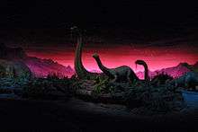 At the conclusion of the film, the seating area rotated once again to face a curtain, which then raised to reveal a primeval diorama. The entire seating area moved into the diorama where it then broke apart into six multi-passenger vehicles that took guests on a seven-minute journey through the diorama, which was populated by numerous animatronic dinosaurs including an Edaphosaurus and two Arthropleura fighting and a family of Brontosaurus in a swamp (complete with realistic "swampy" smell), a Stegosaurus fighting an Allosaurus on an overhead cliff, several Trachodon bathing beneath a waterfall, a number of Ornithomimus watching helplessly as one of their own sank into a boiling tar pit, an Elasmosaurus that lashed out of a tidal pool at guests, and numerous Pteranodon that were perched around an erupting volcano.