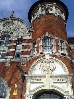 In 1892 the newly formed Borough of West Ham decided to establish a technical institute to serve the local community. Construction started on 29 October 1898, costing £45,000 to build and £15,000 to equip.[1] Designed by Gibson and Russell in the Renaissance Revival architecture style, with added carving introduced by the foreman of construction W.B. Rhind. The frontage towards Romford Road shows figures representing Fine art and science; towards Water Lane are figures symbolical of Literature, Engineering, and Music; two female figures adorn the main entrance, and there are four figures in the niches of the square tower representing Perseverance and Industry.[1] When complete, the building was considered one of the finest in that style, and appeared in various architecture journals of the time.[2]