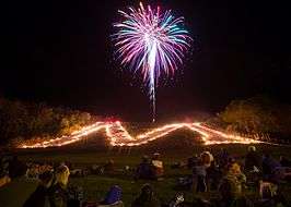 The largest celebration by UW–P students is the twice-annual lighting of the Platte Mound M. The "M" is located on Platte Mound, a nearby large hill east of the city of Platteville.[18]