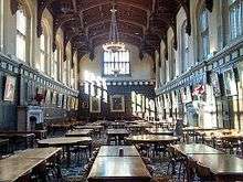 The first buildings of the University of Chicago campus, which make up what is now known as the Main Quadrangles, were part of a "master plan" conceived by two University of Chicago trustees and plotted by Chicago architect Henry Ives Cobb.[65] The Main Quadrangles consist of six quadrangles, each surrounded by buildings, bordering one larger quadrangle.[66] The buildings of the Main Quadrangles were designed by Cobb, Shepley, Rutan and Coolidge, Holabird & Roche, and other architectural firms in a mixture of the Victorian Gothic and Collegiate Gothic styles, patterned on the colleges of the University of Oxford.[65] (Mitchell Tower, for example, is modeled after Oxford's Magdalen Tower,[67] and the university Commons, Hutchinson Hall, replicates Christ Church Hall.[68])