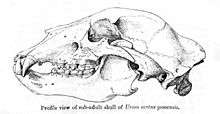 It is very similar to the Kamchatka brown bear, though it has a more elongated skull, a less elevated forehead, somewhat longer nasal bones and less separated zygomatic arches, and is somewhat darker in color, with some individuals being completely black, a fact which once led to the now refuted speculation that black individuals were hybrids of brown bears and Asian black bears. Adult males have skulls measuring 38.7 cm (15.2 in) long and 23.5 cm (9.3 in) wide. They can occasionally reach greater sizes than their Kamchatka counterparts: the largest skull measured by Sergej Ognew (1931) was only slightly smaller than that of the largest Kodiak brown bear (the largest subspecies of brown bears) on record at the time.[3]
