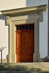 The present church was designed by the architect John Volkart as a cross church in Classicism style. Accessible via a monumental staircase, the transverse church has a massive portico of four columns in Tuscan order and an upstream buttress. In addition to the three portals of the main facade, there are also side portals and raised access on the northeastern side of the tower. The tower has a pointed spire and scalloped gable. The church tower has a height of 54 metres (177 ft) and was added in 1827. The peal consists of four bells, cast in Zürich and consecrated on 27 August 1882. The watch face has a diameter of about 4 metres (13 ft).[3]