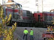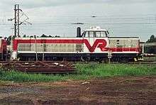 The Dr16 is a class of diesel-electric locomotives used by VR (Finnish Railways). The 23 locomotives have a single, off-centre cab and are currently VR's most powerful diesel locomotives. Their nickname is "Iso Vaalee" (Big Blonde). They are presently mainly used on heavy freight services in northern Finland; their main passenger duty is the haulage of trains on the non-electrified line between Kemi and Kolari in Lapland.[1] Dr16 locomotives were also used extensively on the line between Oulu and Rovaniemi, prior to the completion of the electrification of the line in 2004.[2]