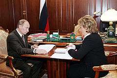Valentina Ivanovna Matviyenko (Russian: Валенти́на Ива́новна Матвие́нко; IPA: [vəlʲɪnˈtʲinə ɪˈvanəvnə mətvʲɪˈjɛnkə], née Tyutina (Тю́тина; IPA: [ˈtʲʉtʲɪnə]); born 7 April 1949), is a Russian politician who was Governor of Saint Petersburg from 2003 to 2011, and has served as Chairman of the Federation Council since 2011. Matviyenko was considered, until recent years, to be the highest-ranking female politician in Russia.