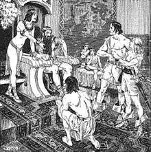 She was tall, full-bosomed, and large-limbed, with compact shoulders. Her whole figure reflected an unusual strength, without detracting from the femininity of her appearance. She was all woman, in spite of her bearing and her garments. The latter were incongruous, in view of her present environs. Instead of a skirt she wore short, wide-legged silk breeches, which ceased a hand's breadth short of her knees, and were upheld by a wide silken sash worn as a girdle. Flaring-topped boots of soft leather came almost to her knees, and a low-necked, wide-collared, wide-sleeved silk shirt completed her costume. On one shapely hip she wore a straight double-edged sword, and on the other a long dirk. Her unruly golden hair, cut square at her shoulders, was confined by a band of crimson satin.— Robert E. Howard, Red Nails