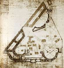 Layout of the new Kremlin "was the most inventive planning effort of Catherine's reign".[14] Bazhenov retained the historical Cathedral Square and proposed creation of a new square in the eastern part of the Kremlin that would become the new center of Moscow and the start of three new radial streets projecting due north, north-west and north-east.[19] The northern radius, passing through a planned opening in the Kremlin wall, would directly connect the palace with Tverskaya Street.[19] Bazhenov expanded his planning into modernizing the city itself, which eventually led to the Projected Plan officially accepted in 1775, a joint effort led by Pyotr Kozhin and Nicholas Legrand.[20]