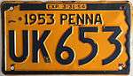 1929 | Orange on dark blue | none | 123-456 | unknown | State name abbreviated "PENNA." Keystone logos on either side of date and state name. | |