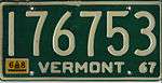 1967–68 | Debossed white numbers on green plate with border line; "VERMONT" debossed in wide white block letters centered at bottom; white rectangular sticker box debossed at bottom left corner and "67" at bottom right corner | none | 123456 | 1 to approximately 187000 | Shade of green changed from forest green to the kelly green still used today. |