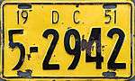 | 1951–52 | Embossed black numbers on golden yellow plate with border line; "D.C." embossed in black block letters centered at top; "19" embossed in top left corner and "51" in top right corner | none | 1234 | 1 to 9999 | ||