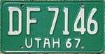 Utah White embossed lettering on green base, "UTAH 67" embossed at bottom. none AB 1234 AA 1000 to approximately FD 5000
