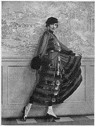 As the couple's celebrity increased in the mid-1910s, Irene Castle became a major fashion trendsetter, initiating the vogue for shorter, fuller skirts and loose, elasticized corsets.[5] She is also credited with introducing American women in 1913 or 1914 to the bob – the short, boyish hairstyle favored by flappers in the 1920s.[6] The elegant, yet simple, flowing gowns Irene wore on stage and screen were regularly featured in Vogue, Harper's Bazaar and other fashion magazines. These were often supplied by the famous couturier Lucile, but Irene also designed some of her clothes herself.[7] The slender, elegant Castles were pioneers in other ways: they traveled with a black orchestra, James Reese Europe's Society Orchestra,[8] and had an openly lesbian manager, Elisabeth Marbury.