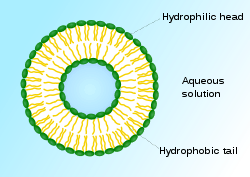 Closed structure formed by amphiphilic molecules that contains solvent (usually water).[2]