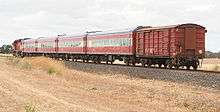 In 1995 a new livery was introduced for V/line's Passenger operations. In lieu of the orange with white, green and grey, rollingstock was painted in all-over red with a black underframe and blue roof. This livery was applied to a handful of wagons retained by V/Line Passenger for use on their services; 302, 322, 324, 335 and 339. Generally speaking, the code layout was replicated from the orange days; 302TD,[7][8][9] 322TD,[10] DT 324,[11][12] DT335,[13] and DT 339[14][15]