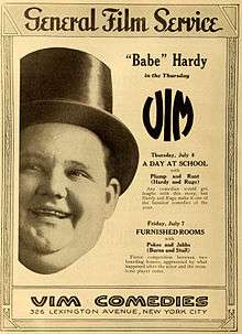 The Vim Comedy Company was a short lived movie studio in Jacksonville, Florida and New York City. Vim bought out Siegmund Lubin's Lubin Manufacturing Company Jacksonville, Florida facilities located at 750 Riverside Avenue in 1915 after that company went bankrupt. It was founded by Louis Burstein and Mark Dintenfass.[1] Vim specialized in two-reel comedies, producing hundreds of them in the short time it existed. Notable Vim actors were Oliver Hardy, Ethel Marie Burton, Walter Stull, Billy Ruge, Rosemary Thebe, Billy Bletcher and his wife Arline Roberts, and Kate Price. At its peak Vim had a workforce of nearly 50 people. The Vim Comedy Company went out of business in 1917 after Oliver Hardy discovered that both Burstein and Dintenfass were stealing from the payroll.[2] Vim was bought out by the King Bee studio started by Burstein.
