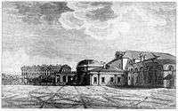 Paul shut down Catherine's projects in Tsarskoye Selo and placed the redundant workforce at Brenna's disposal.[45] He wanted to see the castle externally complete by the end of 1797, so work on site, employing up to 6,000 men, continued day at night while all other residents of Saint Petersburg were ordered to sleep after dusk.[46] Indeed, walls of the castle and nearby Exerzierhaus (Riding House) were built (but not finished in stone) by the end of October 1797.[47] Brenna, realizing that existing project management controls will delay completion, demanded elimination of all financial controls and intermediaries between Paul and himself. Paul agreed and allowed Brenna unchecked access to state finances;[48] in the end, total cost of the Castle reached six million roubles in gold.[49]