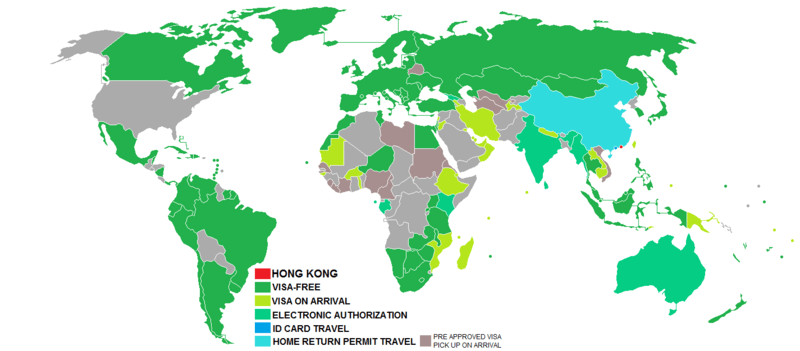 Visa requirements for Chinese citizens of Hong Kong are administrative entry restrictions by the authorities of other states placed on holders of Hong Kong SAR passports. In February 2016, Chinese citizens of Hong Kong holding Hong Kong SAR passports had visa-free or visa on arrival access to 154 countries and territories, ranking the Hong Kong Special Administrative Region passport 20th in the world according to the Visa Restrictions Index.[1] The official figure provided by the Hong Kong Immigration Department of countries and territories granting visa-free access to Hong Kong SAR passport holders is 157 as of 28 October 2016. (Note, however, that this figure excludes countries and territories which are not officially recognised by the People's Republic of China, such as Kosovo and Taiwan.)[2]