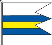The Volkovce flag consists of four horizontal stripes – white, blue, yellow and blue. The ratio of the sides of the flag is 2:3 and the right hand side has a jagged edge. The colours of the stripes correspond to the colours of the Volkovce's crest.